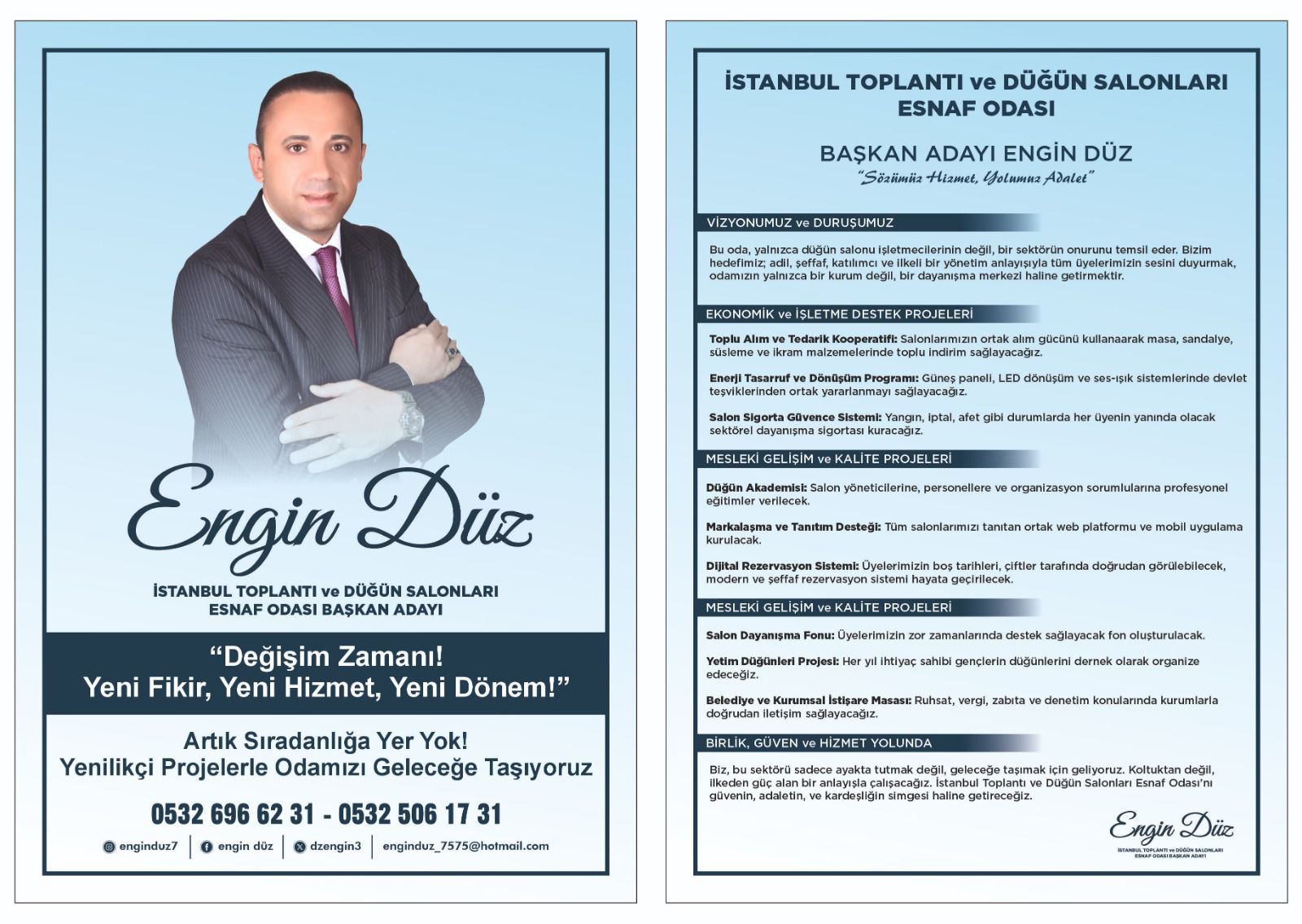 Engin Düz, “Değişim Zamanı, Yeni Fikir, Yeni Hizmet” mottosuyla yola çıktığı, İSTDO (İstanbul Toplantı ve Düğün Salonları Esnaf Odası) başkanlık seçiminde alışılmışın dışında bir anlayış ile “Artık Sıradanlığa Yer Yok! Yenilikçi Projelerle Odamızı Geleceğe Taşıyoruz” dedi.